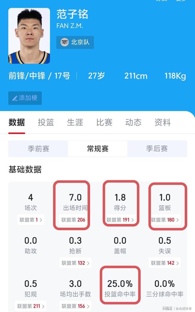 值得一提的是,此役,頂薪的范子銘又拉胯了。他出場9分07秒,4投0中,運動戰僅靠罰球得到1分,數據為1分0板0助。在這場比賽中,范子銘替補登場,按打得時間也不算短,但進攻端實在是太糟糕了。投籃不是打鐵就是被蓋,完全不像一位頂薪內線的表現,打了近10分鐘,2米12身高,竟然沒搶到一個籃板……