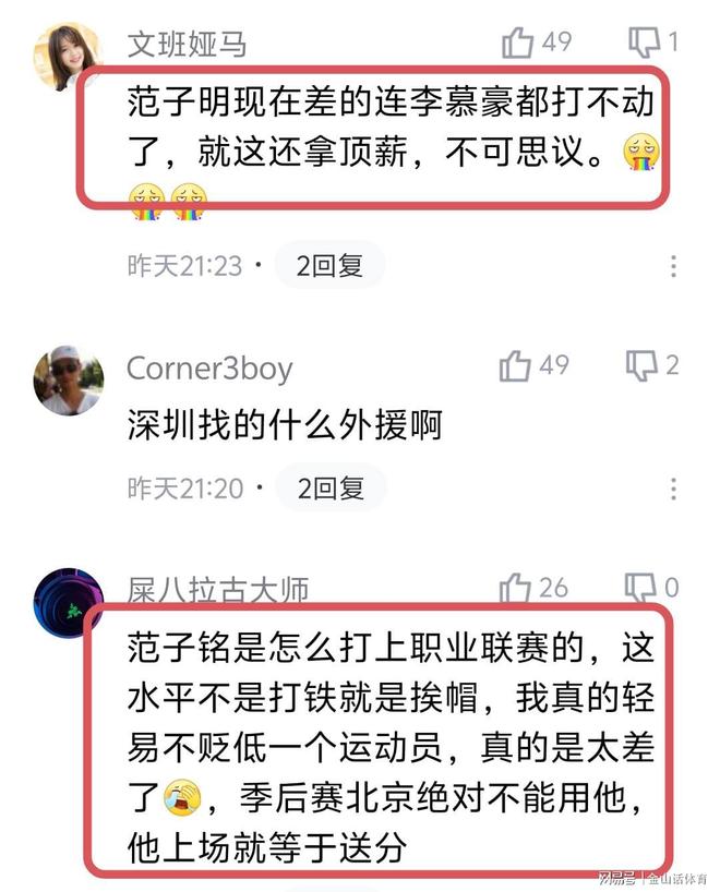 范子銘如今糟糕的表現,也引用球迷的紛紛吐槽。“范子明現在差的連李慕豪都打不動了,就這還拿頂薪,不可思議。”;“范子銘是怎么打上職業聯賽的,這水平不是打鐵就是挨帽,我真的輕易不貶低一個運動員,真的是太差了,季后賽北京絕對不能用他,他上場就等于送分。”。